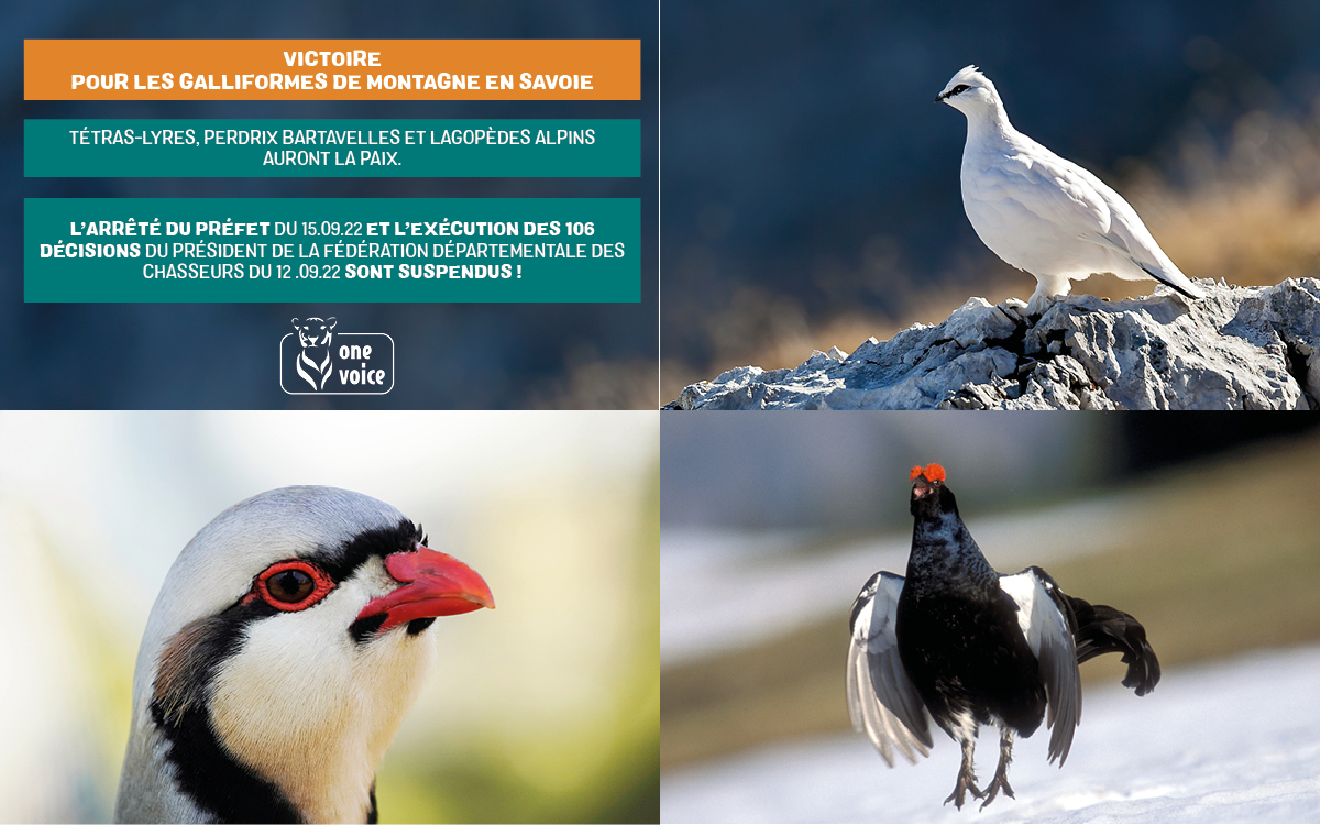 One Voice vient d’obtenir la suspension en urgence de l’arrêté préfectoral de Savoie épargnant ainsi la vie de centaines de Tétras lyres, Perdrix bart...